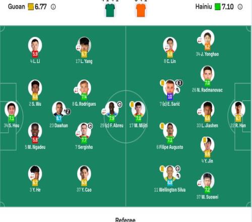 中场:6-菲利佩-奥古斯托(F)、7-萨里奇(F)、8-林创益(69’30-车世伟);