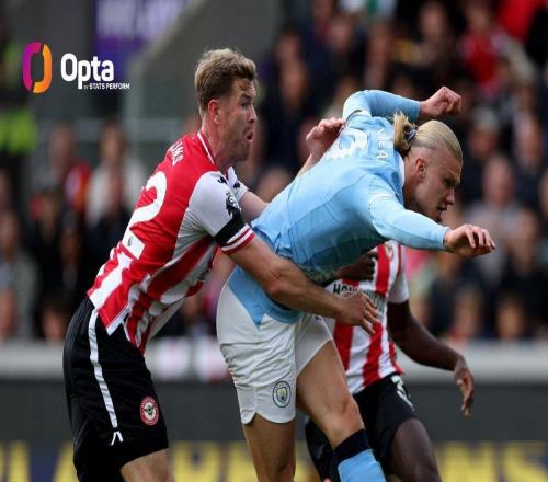英超第7轮,曼城客场对阵布伦特福德,上半场哈兰德破门为曼城取得领先,至此,哈兰德在英超出战过的23座球场已有22座取得进球。此役客场对阵布伦特福德,首发出战的哈兰德在比赛第9分
